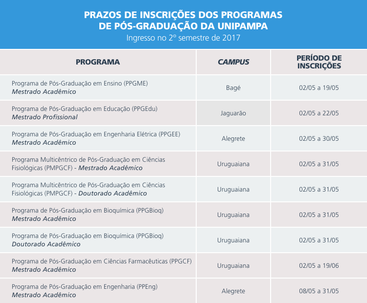 A Universidade Federal do Pampa (Unipampa) está com inscrições abertas para seleções de ingresso em Programas de Pós-Graduação. São ofertadas vagas para mestrados e doutorados em quatro campi da Unipampa: Bagé, Jaguarão, Alegrete e Uruguaiana. As aulas iniciam no segundo semestre de 2017.