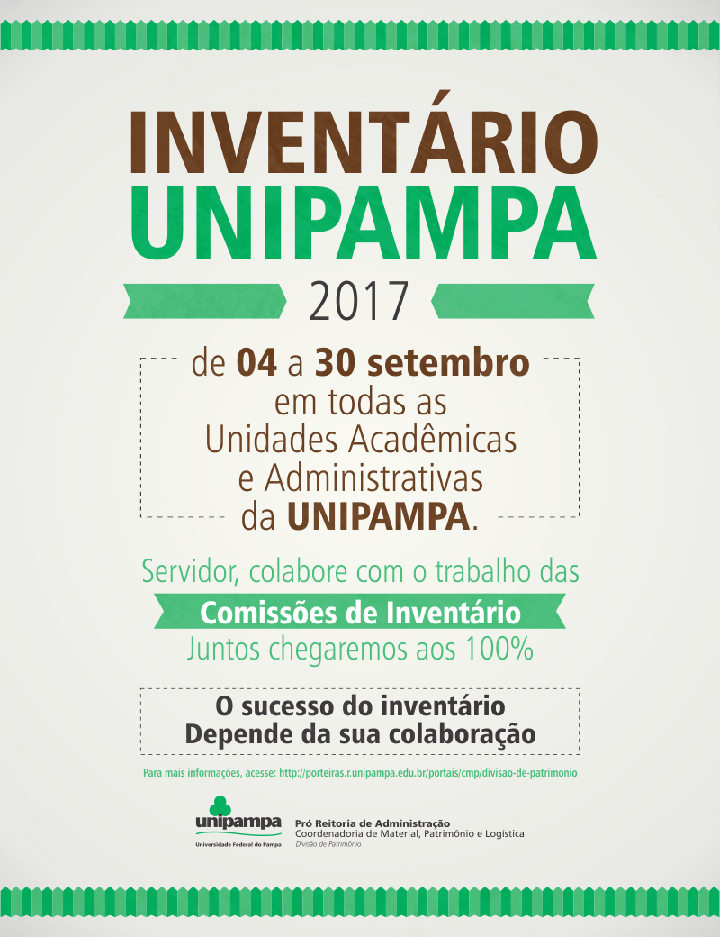O Inventário Patrimonial 2017 será realizado entre os dias 04 e 30 de setembro em todas as Unidades da Unipampa com auxílio das Comissões Especiais Inventariantes. O processo é conduzido pela Divisão de Patrimônio da Coordenadoria de Material, Patrimônio e Logística, vinculada à Pró-reitoria de Administração (Proad) da Unipampa.