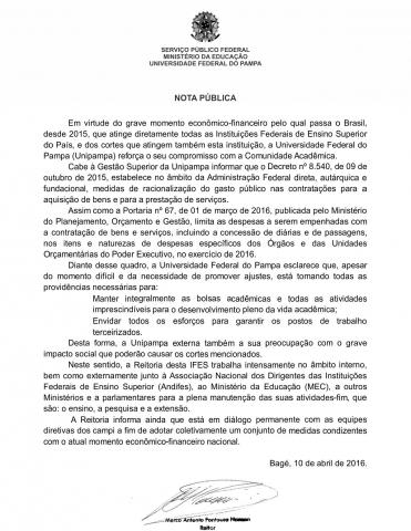 Em Nota Pública, a Unipampa “esclarece que, apesar do momento difícil e da necessidade de promover ajustes, está tomando todas as providências necessárias para: manter integralmente as bolsas acadêmicas e todas as atividades imprescindíveis para o desenvolvimento pleno da vida acadêmica; envidar todos os esforços para garantir os postos de trabalho terceirizado”.