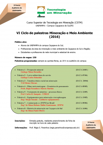 O Curso Superior de Tecnologia em Mineração da Universidade Federal do Pampa (Unipampa) promove ao longo deste semestre o VI Ciclo de palestras Mineração e Meio Ambiente. As atividades serão sempre às quintas-feiras, a partir das 19h, no auditório do Campus Caçapava do Sul. A atividade é voltada aos acadêmicos do Campus, profissionais da área de mineração e meio ambiente da cidade e da região, além de estudantes e professores das rede municipal e estadual de ensino.